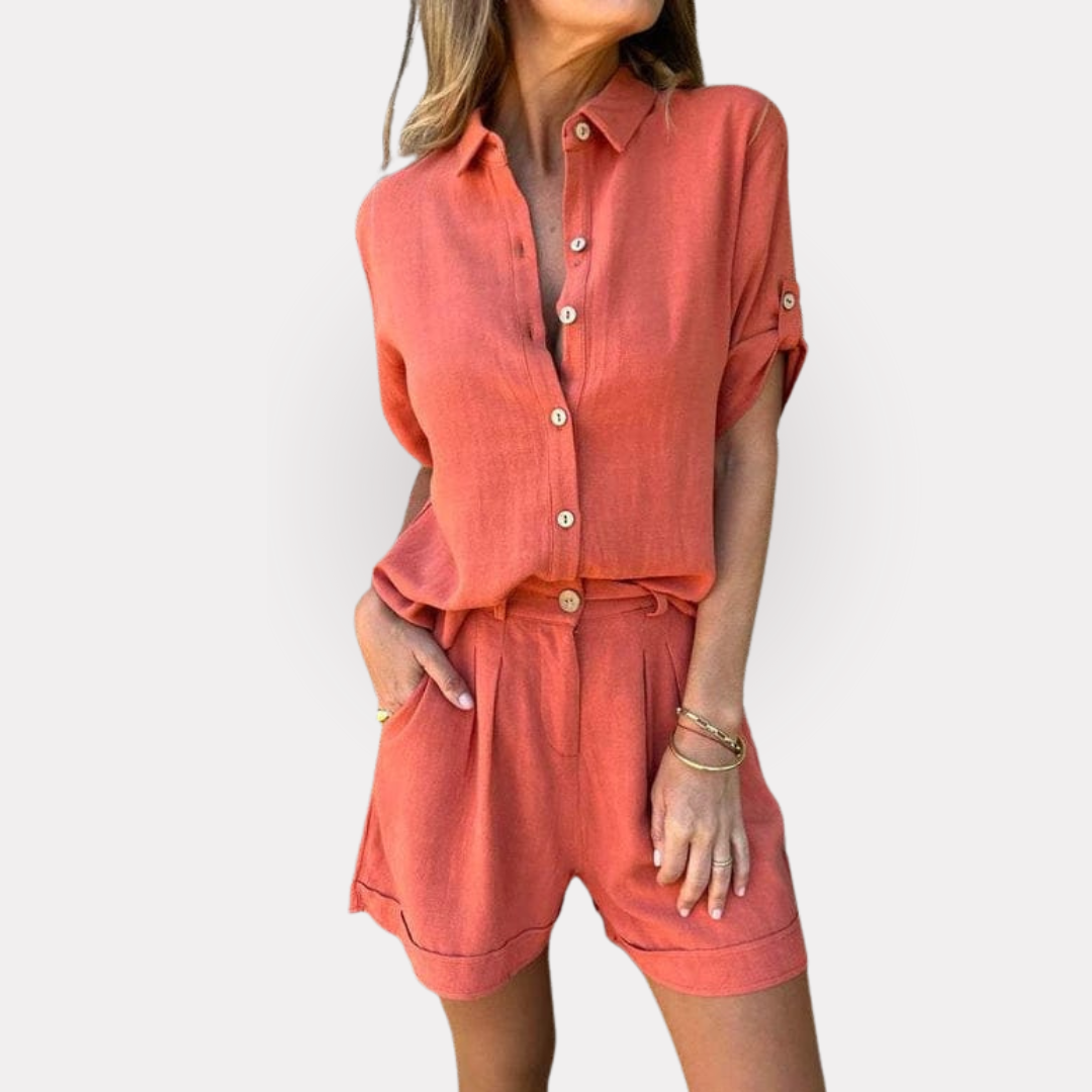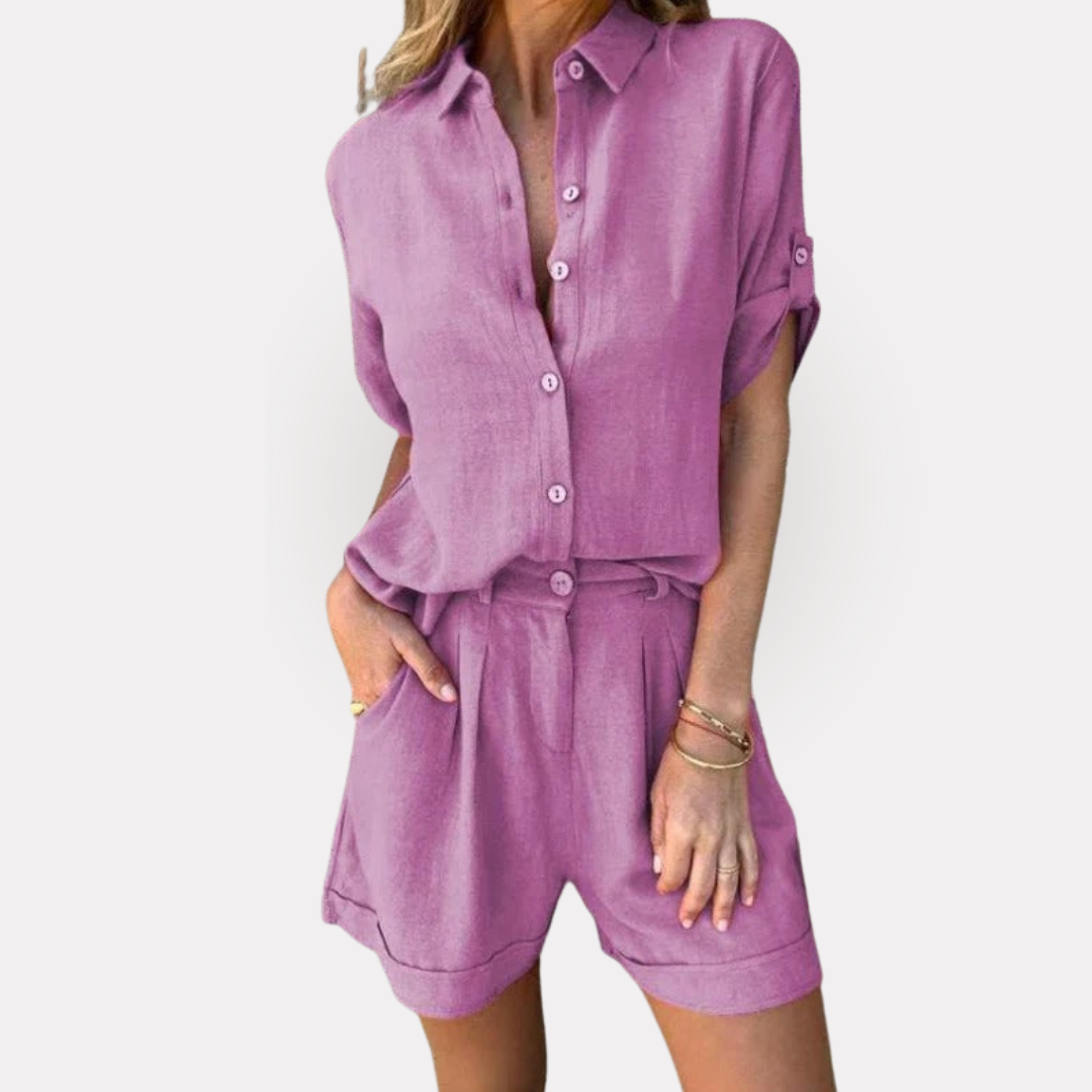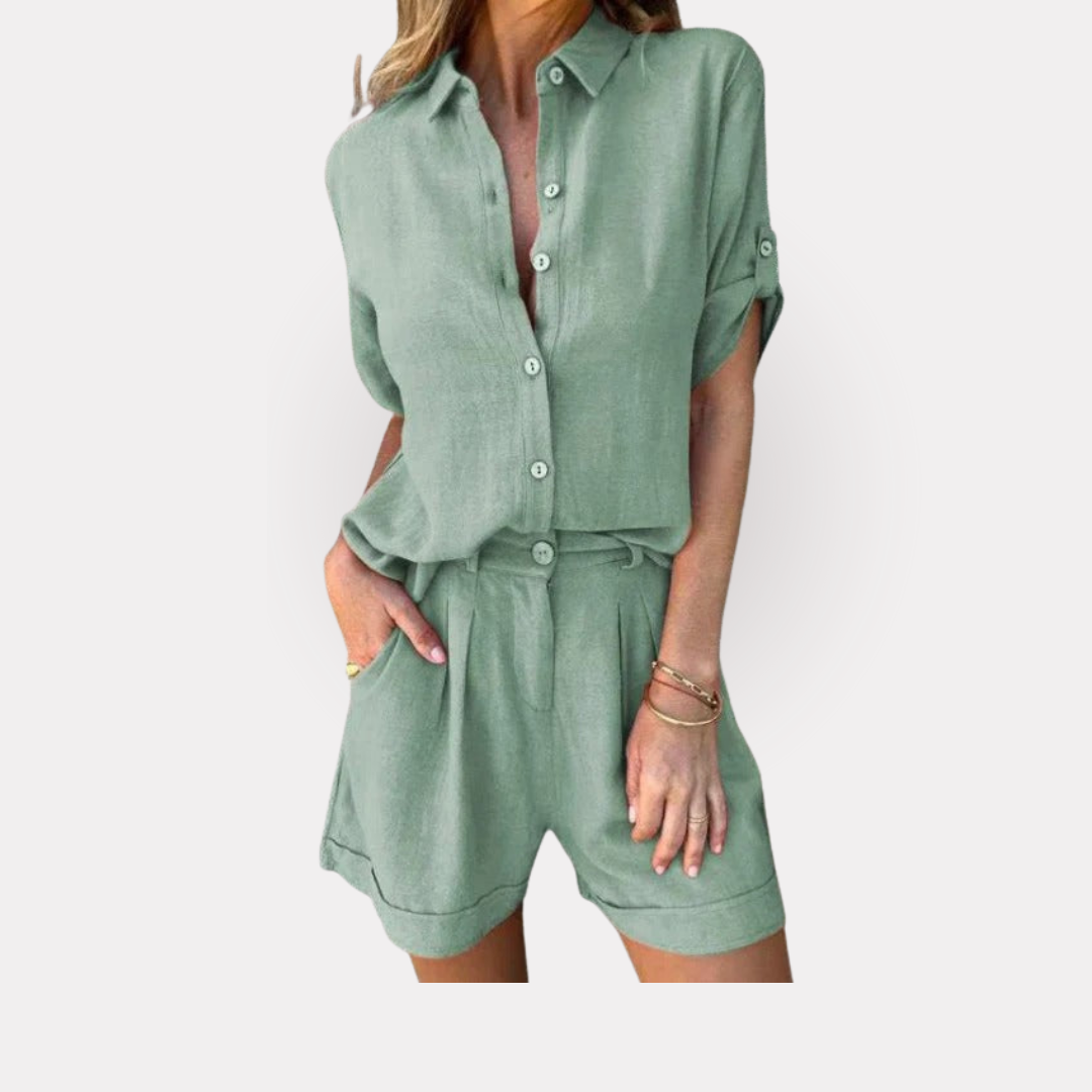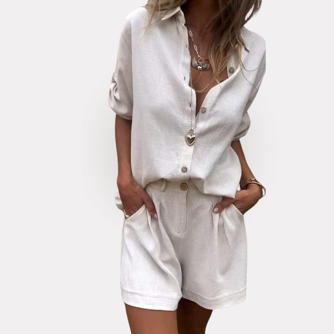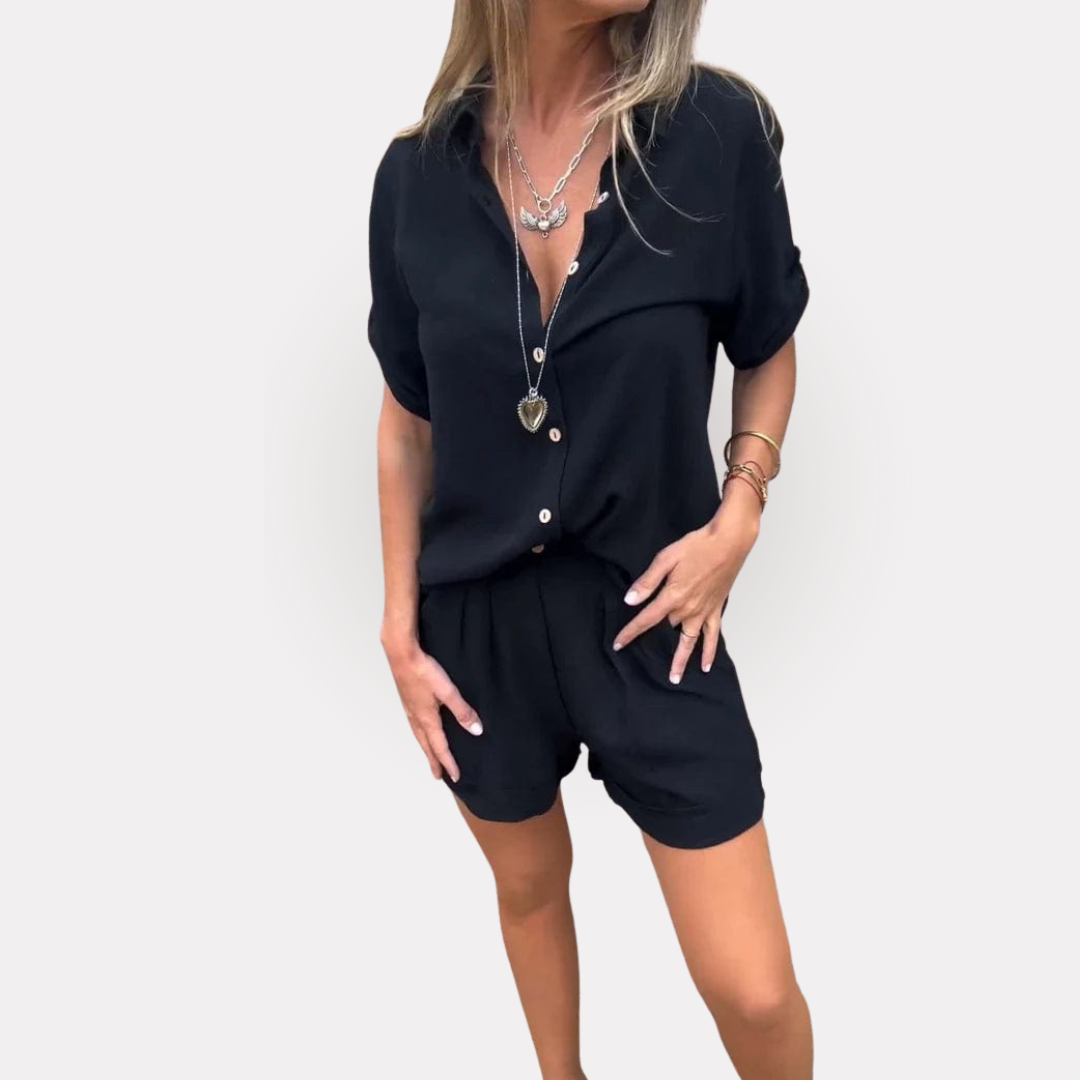 Design Chic et Intemporel : Avec sa blouse boutonnée et son short ajusté, cet ensemble allie sophistication et simplicité pour toutes les occasions.